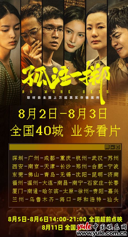 《孤注一掷》已开启预售,并官宣于8月5日、8月6日14:00-21:00在全国进行超前点映活动,届时观众能提前在电影院感受境外网络诈骗的骇人真相,避免落入诈骗集团的层层陷阱。