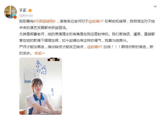 此前,赵晴在《无限超越班》中的表现不尽人意,作为导师的郝蕾也对赵晴进行了批评和指正。而于正本人在看完这一期的节目之后也发文回应赵晴遭受到批评,表示:“感谢各位老师对于赵晴的帮助和指导,我相信这对于她未来的演艺发展都会获益匪浅。尤其是郝蕾老师,她的表演理念和审美是在我这里封神的。我们家瑞贤、谨言、星越都曾在她的教诲下熠熠生辉,如今赵晴也有这样的福气,我真为她高兴。严师才能出高徒,指出缺点才能改正缺点,赵晴加油!!!期待你新的角色,新的进步。”