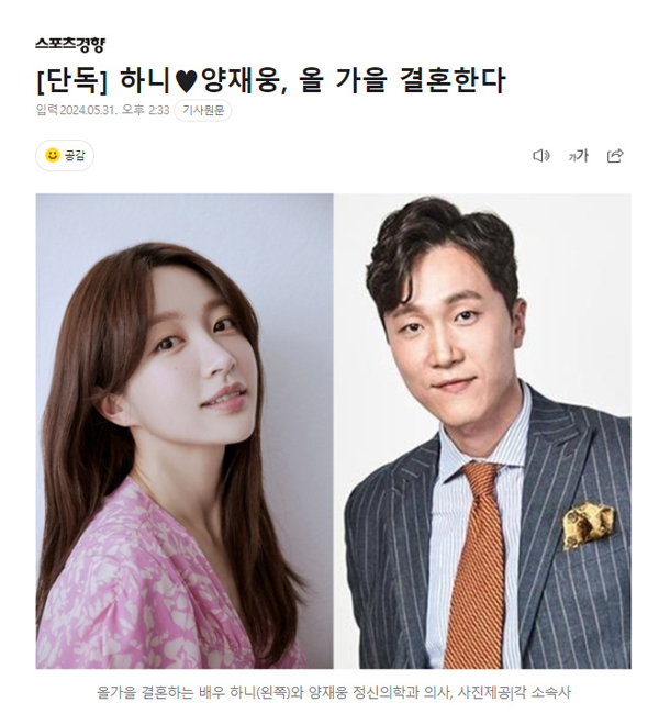 消息公开之后,网友们也表示很惊喜,纷纷询问是否可靠。对于此,Hani的经纪公司方面称:“由于这是演员的私生活,所以不进行回应。”但很多媒体都对此进行了报道,Hani本人也没有否认,大家猜测应该是真的了。今年9月,她就将成为别人的新娘。