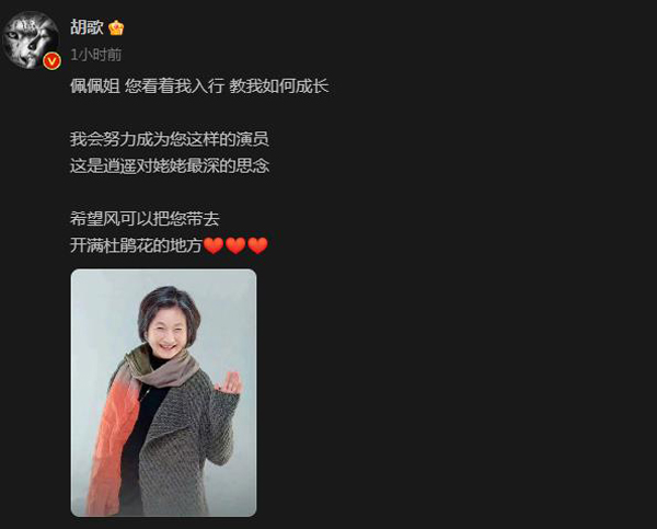 胡歌发文写到:“佩佩姐,您看着我入行,教我如何成长。我会努力成为您这样的演员,这是逍遥对姥姥最深的思念。希望风可以把您带去,开满杜鹃花的地方。”