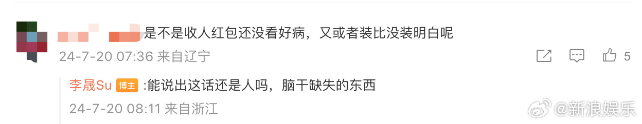 中国娱乐网讯 www.yule.com.cn 7月20日,据相关媒体报道称,有网友错把女演员李晟认成是去世的医生李晟,并且跑到她微博评论区留言表示:“是不是收人红包还没看好病,又或者是装比没装明白呢?”面对这样的留言李晟也表示很气愤,她怒怼这名网友,表示:“能说出这话还是人吗,脑干缺失的东西。”