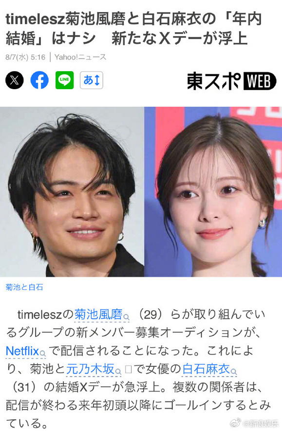根据日媒爆料,Sexy Zone”菊池风磨(29)将会在明年年初timelesz新成员选秀节目播出结束后,和原“乃木坂46”白石麻衣(31)结婚,两人将正式步入婚姻的殿堂。