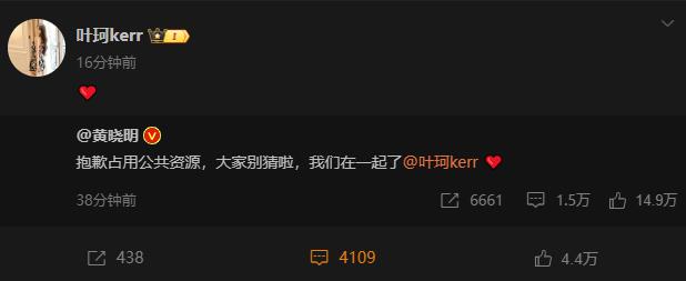 中国娱乐网讯 www.yule.com.cn 9月19日,黄晓明方面发文公开了与叶珂的恋情,称抱歉占用公共资源,表示大家不用猜了,我们确实在一起了,并且艾特了叶珂,正式官宣与叶珂的恋情。