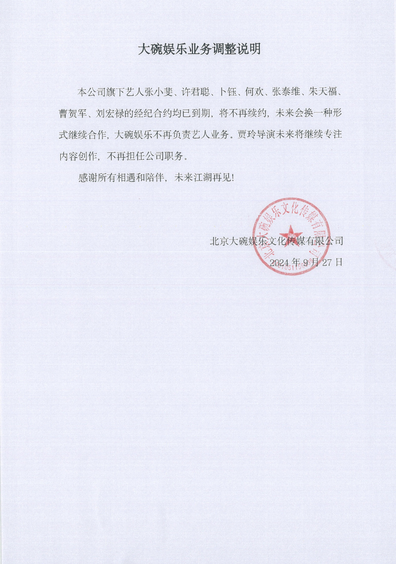 中国娱乐网讯 www.yule.com.cn 9月27日,大碗娱乐官方微博发文称公司将进行业务调整,旗下所有艺人张小斐、许君聪、卜钰、何欢、张泰维、朱天福、曹贺军、刘宏禄的经纪合约已到期,将不再续约,未来会换一种形式继续合作。