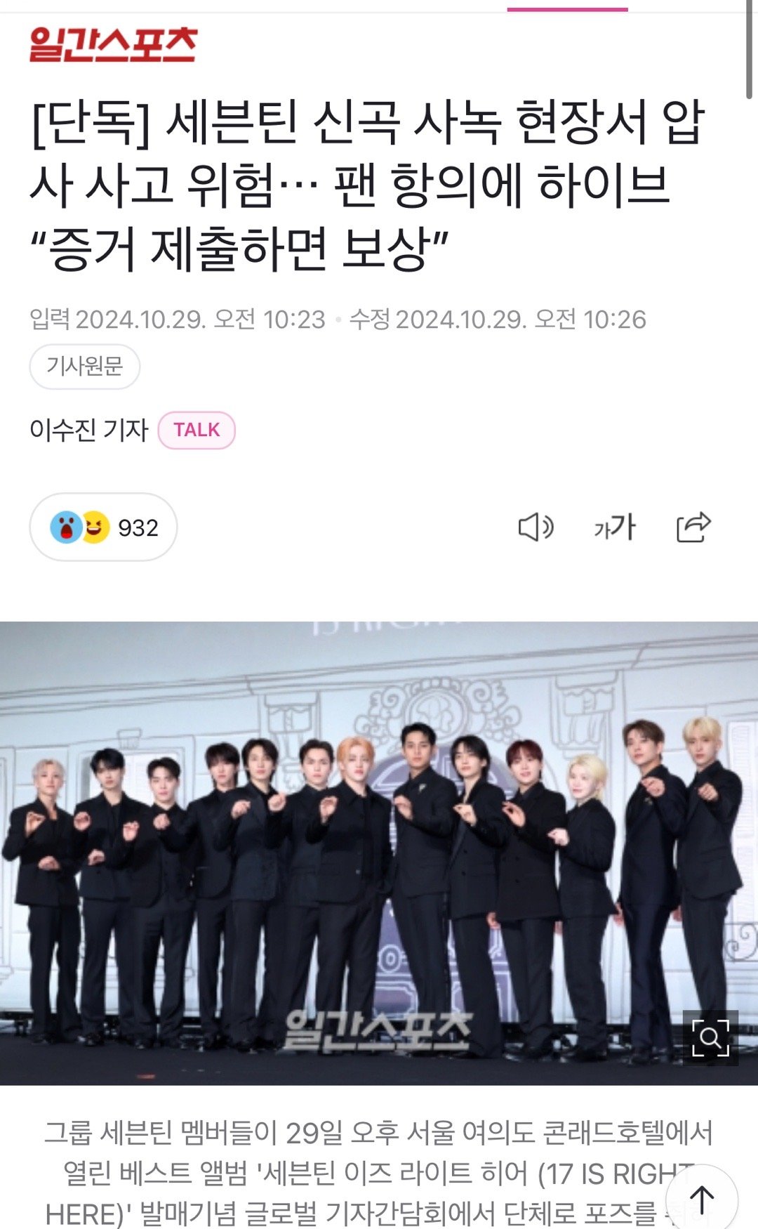 在文章中,A某指责道:“作为大企业及拥有巨大影响力的公司,Pledis和HYBE、CJ ENM在粉丝们呼吁遭受损失的情况下却一律无视、置之不理。”