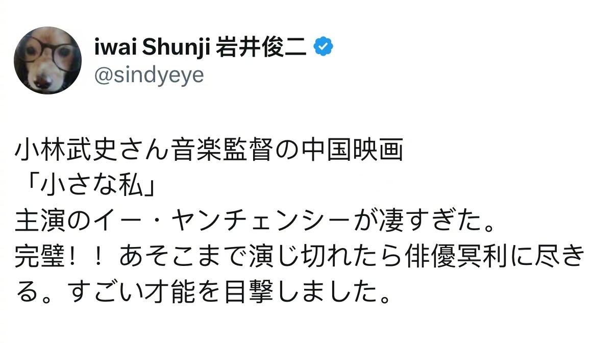 岩井俊二表示:“小林武史担任了中国电影《小小的我》的音乐监制,主演易烊千玺实在太出色了,完美!!能演绎到那种程度,真是演员的无上荣光,我见证了他惊人的才华。”