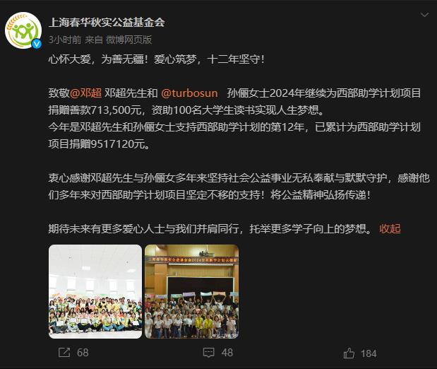 致敬邓超先生和孙俪女士2024年继续为西部助学计划项目捐赠善款713,500元,资助100名大学生读书实现人生梦想。