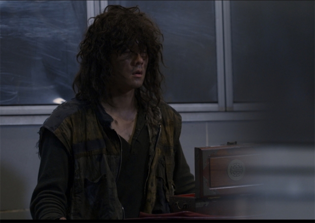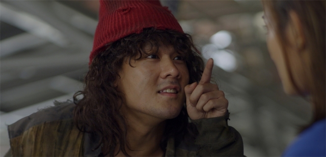 许瑞奇在《带剑女孩》一出场便是古怪峰巅、言行诡异的街头流浪者“够力哥“,拉着破旧行李箱,口中念念有词说着听不懂的话,行为举止令路人避之不及。许瑞奇以极具夸张的肢体语言和神经质的表情,塑造出一个充满危险与神秘的“够力哥”,而“够力哥”变成这个样子,是为了躲避师兄周德坤的追杀。