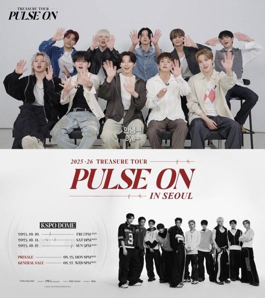 中国娱乐网讯 www.yule.com.cn YG男团TREASURE将于10月10日至12日连续三日在首尔松坡区芳荑洞KSPO DOME举办"2025-26 TREASURE TOUR [PULSE ON] IN SEOUL"。