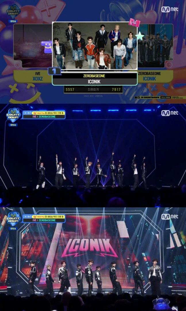 中国娱乐网讯 www.yule.com.cn ZEROBASEONE于11日播出的Mnet《M COUNTDOWN》节目中,凭借正规一辑《NEVER SAY NEVER》主打曲《ICONIK》再次荣登一位。继斩获《THE SHOW》与《SHOW CHAMPION》节目一位之后,组合连夺三冠,连续捧起三座奖杯,气势如虹席卷而来。