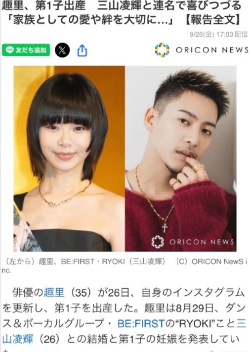 中国娱乐网讯 www.yule.com.cn 女演员趣里(35岁)于9月26日更新个人社交媒体,宣布第一胎平安诞生。她曾于8月29日公布与BE:FIRST成员RYOKI(本名三山凌辉,26岁)结婚及怀孕喜讯。