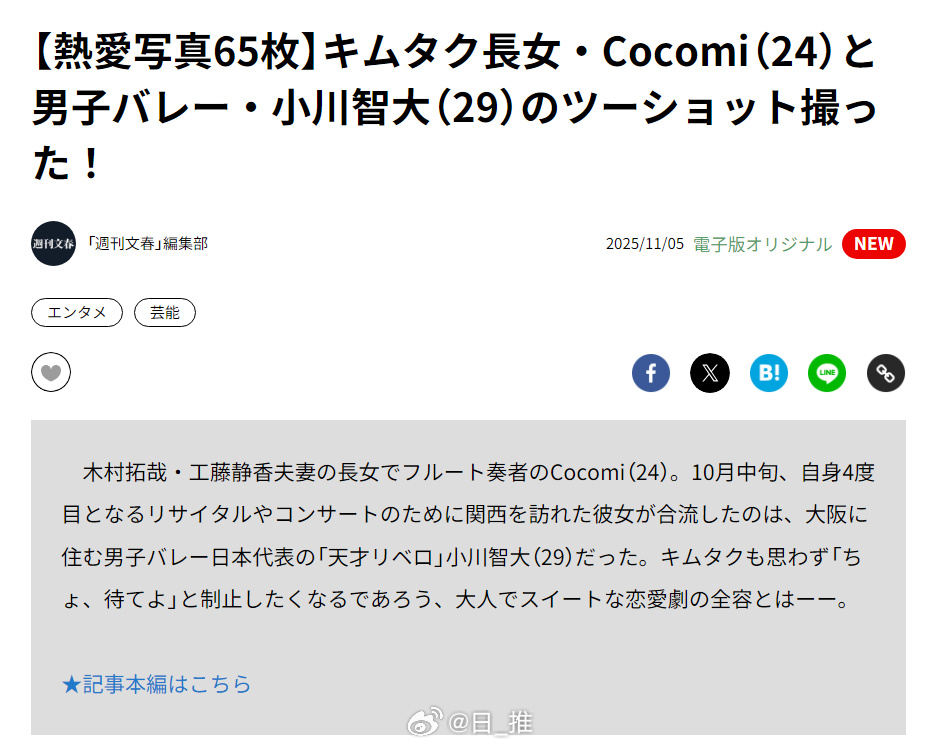 据该媒体报道,Cocomi今年10月在关西举行音乐会期间,多次被拍到出入小川智大位于大阪的公寓。两人一同外出购物、同车出行,相处模式自然亲密,氛围宛如新婚夫妇。