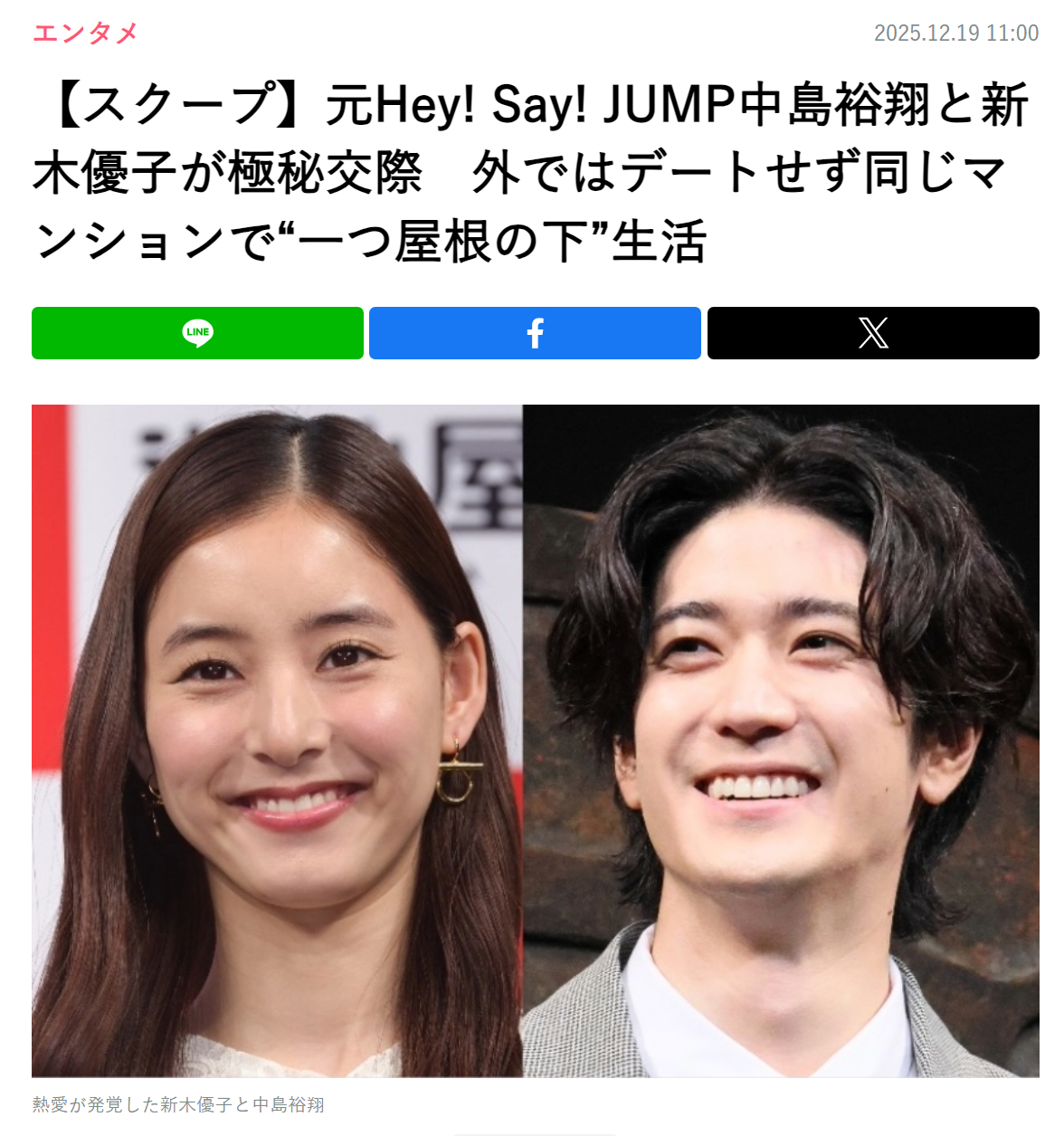 中国娱乐网讯 www.yule.com.cn 据日本杂志《NEWS POST SEVEN》12月19日报道,今年8月退出Hey! Say! JUMP的中岛裕翔(32岁)正与同龄女演员新木优子认真交往,关系被描述为“以结婚为目的”。报道称,新木优子已于2025年夏前搬入中岛所住公寓的不同楼层,处于“楼上楼下”的半同居状态。